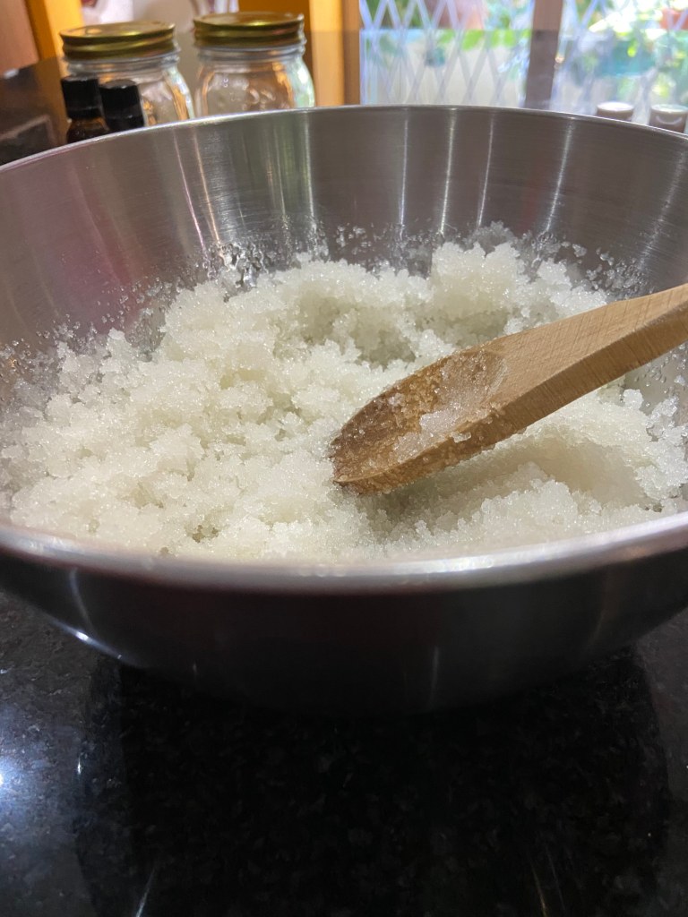 The first step to making your body scrub is to pour your sugar and melted coconut oil into a mixing bowl and to mix it gently until it is evenly combined.