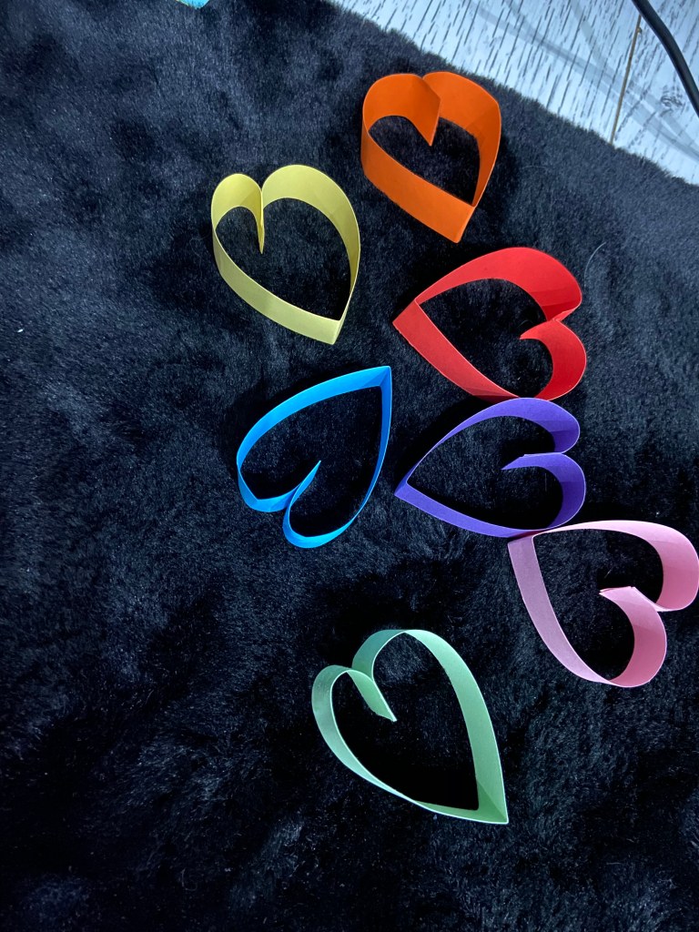 Now, repeat this process with all of your strips. You should end up with eight colourful little paper hearts. Like so: