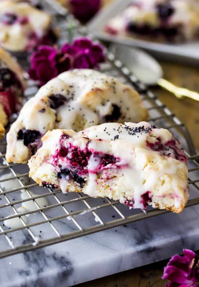 I’ve been talking about chocolate non-stop, and I get that it can end up being a little too rich and overpowering. Sometimes the dessert that really hits the spot is one that isn’t too sweet and is, in fact, more on the delicate, tart side of the dessert scale. I’ve made these a few times for family events (like brunches and such). Still, I’ve added them to my Valentine’s list because I associate not only chocolate but also all of those lush red berries with Valentine’s day (hence chocolate-covered strawberries). Mixed berry scones are a great treat because they are a little bit sweet, a little bit savoury and if you eat them for breakfast, it doesn’t quite come with the same guilt as eating gingerbread or things covered in chocolate.