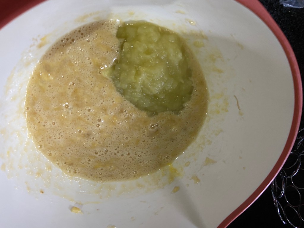 - When your apple sauce has cooled down so it isn’t scalding hot, pour it into the banana mixture. The reason why the apple sauce needs to cool a little before you can add it is because if it’s too hot, then the apples will cook the egg prematurely and mess up your batter.