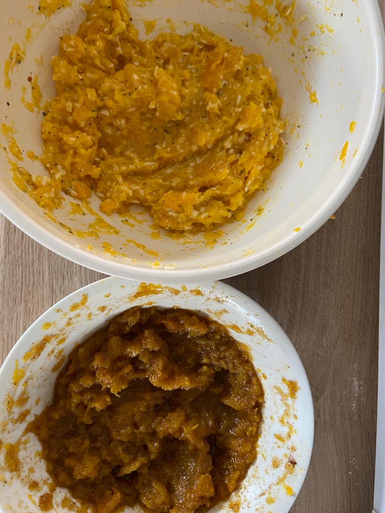 - For the savoury version, mix the pumpkin with the cheese, butter, garlic and seasonings. Set aside.