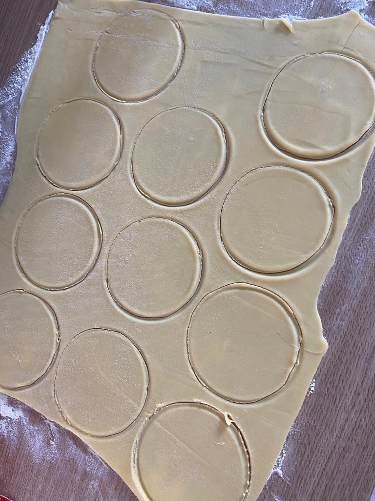 - Dust your surface lightly with flour and roll out the pastry until it is about 1/8 of an inch thick. Using either a pastry cutter, a mug or a glass, cut the pastry into 10cm circles (or larger if you prefer).