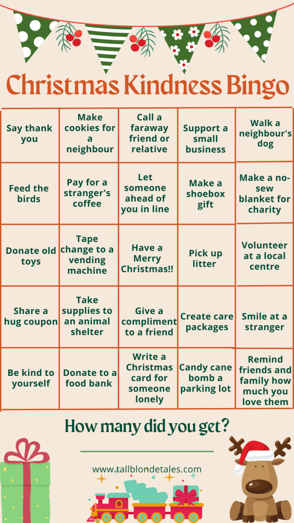 I’ve always been a big believer that one of the best things you can do is give back, be kind and try help others in any way you can and I think that sentiment rings even more true at Christmas time. When things might not be so merry and jolly for some people, it’s so important to be grateful for what we have and try to help others have a good Christmas. I hope you all enjoyed my Christmas Kindness Bingo!! I challenge you all to see how many you manage to tick off by Christmas day, and maybe even add in a few ones that you think I’ve missed out – speaking of… let’s chat in the comments section if you do any of these each year, if there are any you think I’ve missed out or what sort of Christmas kindness you relate to the most!! Alright that’s it for your daily dose of jingly merriment from Blogmas on Tall Blonde Tales – I’ll see you all tomorrow. I promise it won’t be another list of 25 things!