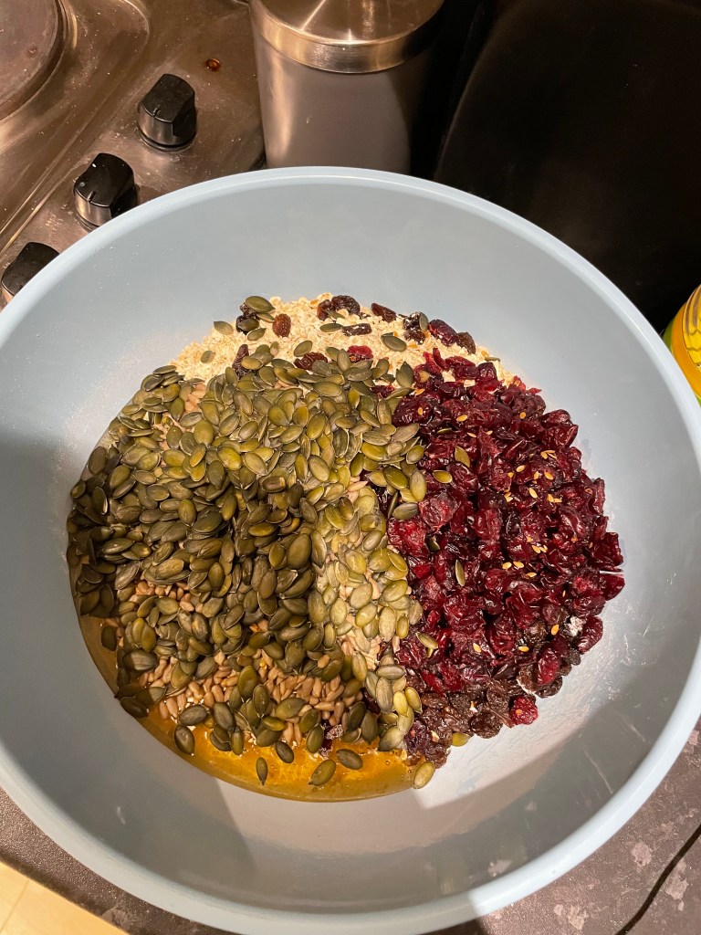 • Sift the flour and salt together into a big bowl. Add the oats, sugar, honey, raisins, cranberries, all the seeds and spices and mix to combine them.