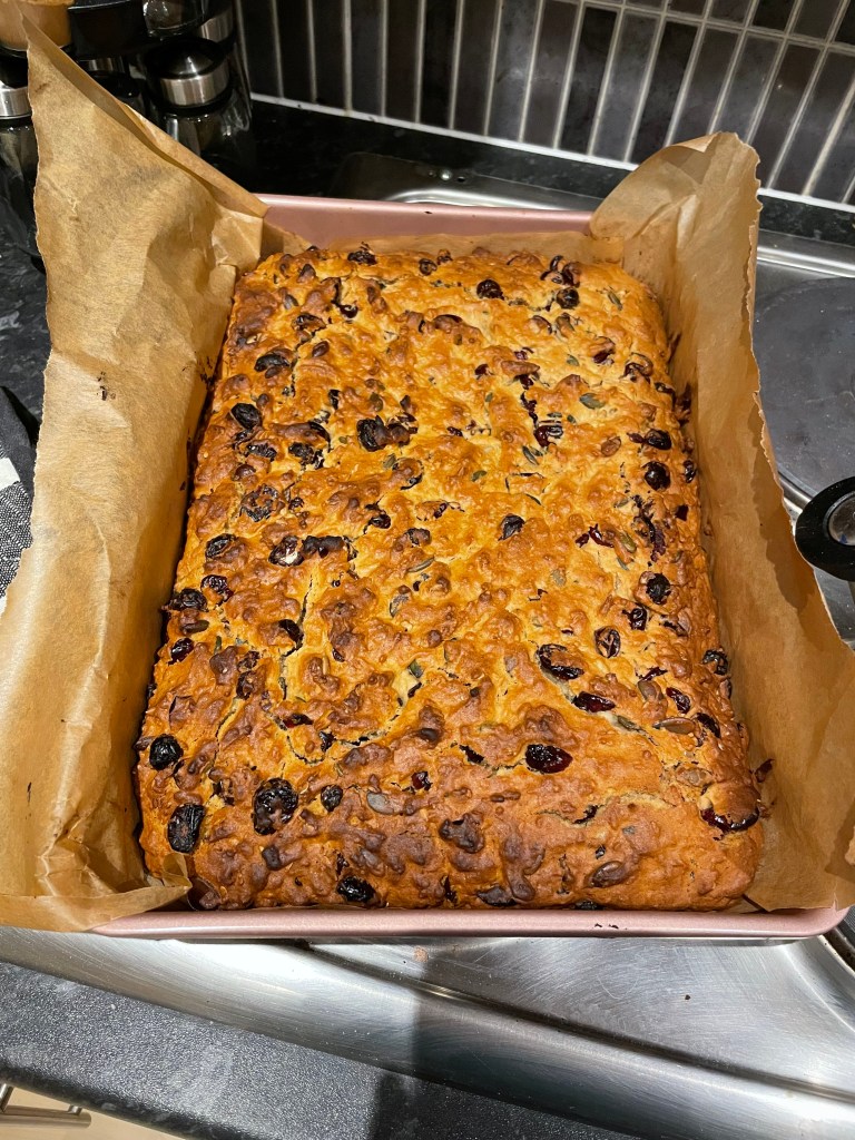 ‘All the ingredients you would have in a cereal bar, baked into a cake that’s not particularly sweet. You slice up the cake and then dry out the slices so they have the same texture as biscotti.’